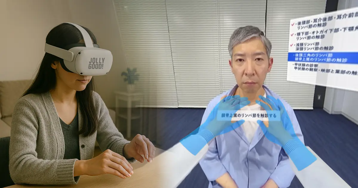 さらに、ハンドトラッキング機能によりVR空間上の医師の手に自分の手を重ねることができるため、実際に診察している感覚でより効果的に学べます