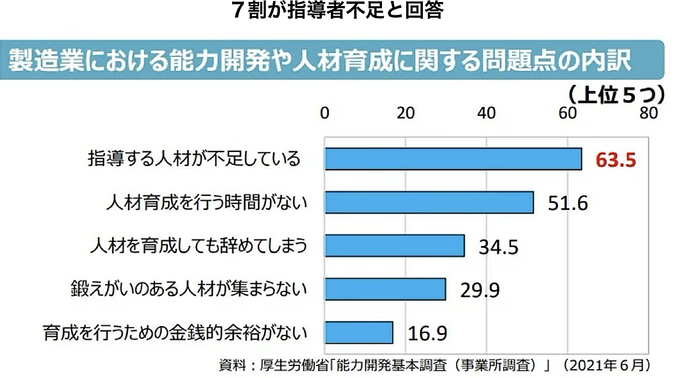 厚生労働省の調査によると、若年層の3年以内離職率は製造業で約30%、サービス業では50%を超え、その主な理由は「技術習得の困難さ」と「適切な指導者の不在」です。