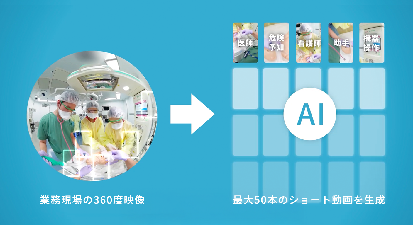 本システムは、職場や作業現場を360度カメラで撮影したVR映像をAIが分析し、教育的価値の高い場面をAIが自動で発掘・抽出し、予習・復習に最適なショート動画コンテンツを生成します 。