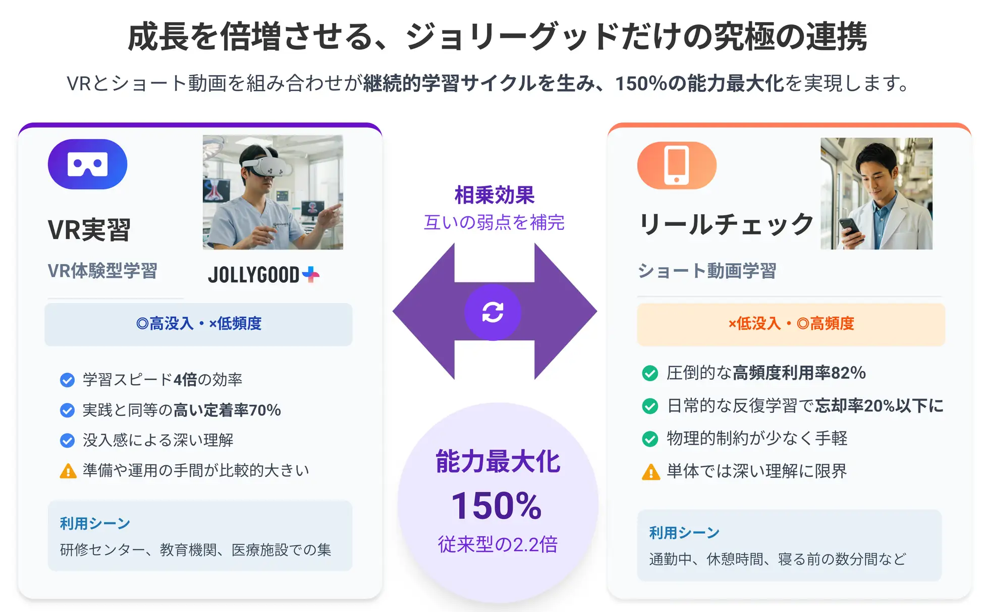 当社のVR教育プラットフォーム「JOLLYGOOD+」と完全連携。リールチェックで基礎を学んだ後、VR環境で実践練習を行う段階的な学習サイクルが、知識の定着と実践力強化を実現します。